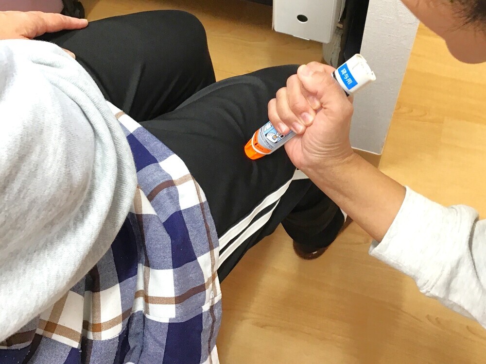 アナフィラキシーショックへ対応できるよう、エピペン講習も行ないました。医療用品を扱う緊張感もあり、職員で声を掛け合いながら、もしもの時を想定して取り組みました。