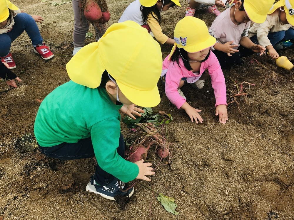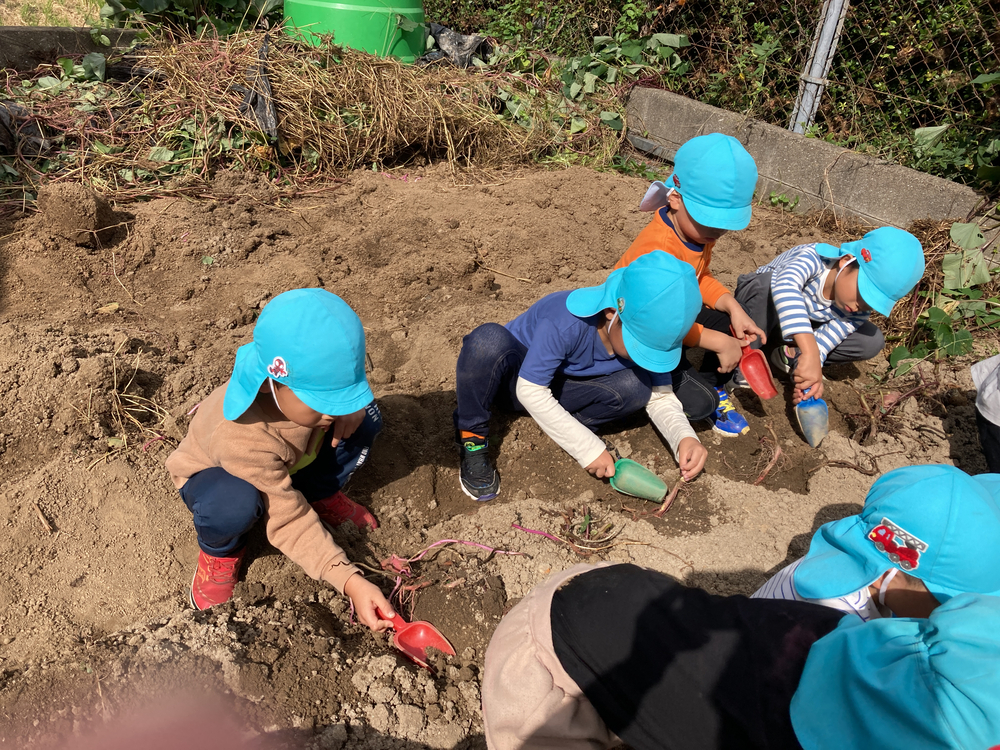 うんとこしょ、どっこいしょ、地中に根がはっていて、なかなか抜けませんでしたが、土をたくさんほって収穫した時はみんな大喜び♪